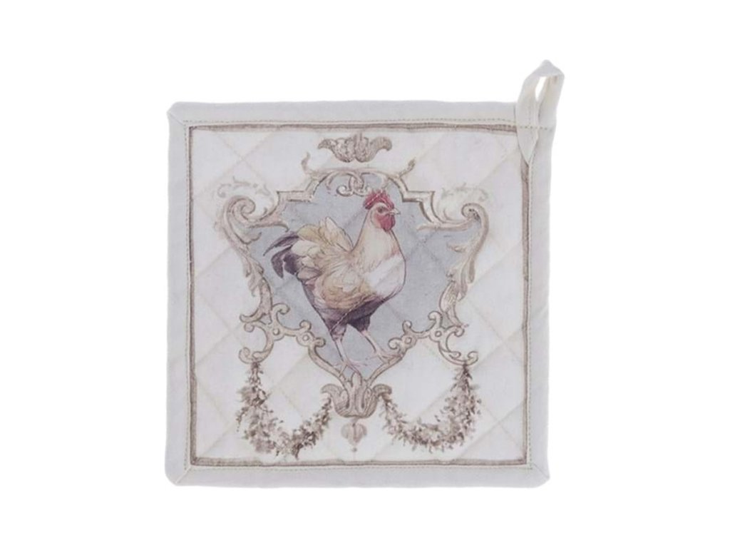 rozmery: 20 × 20 cm • materiál: 100 % bavlna • kolekcia: Coco • motív: kohútik • farba: biely podklad, hnedé / modré / červené odtiene • štýl: vidiecky / vintage • použitie: kuchynská chňapka