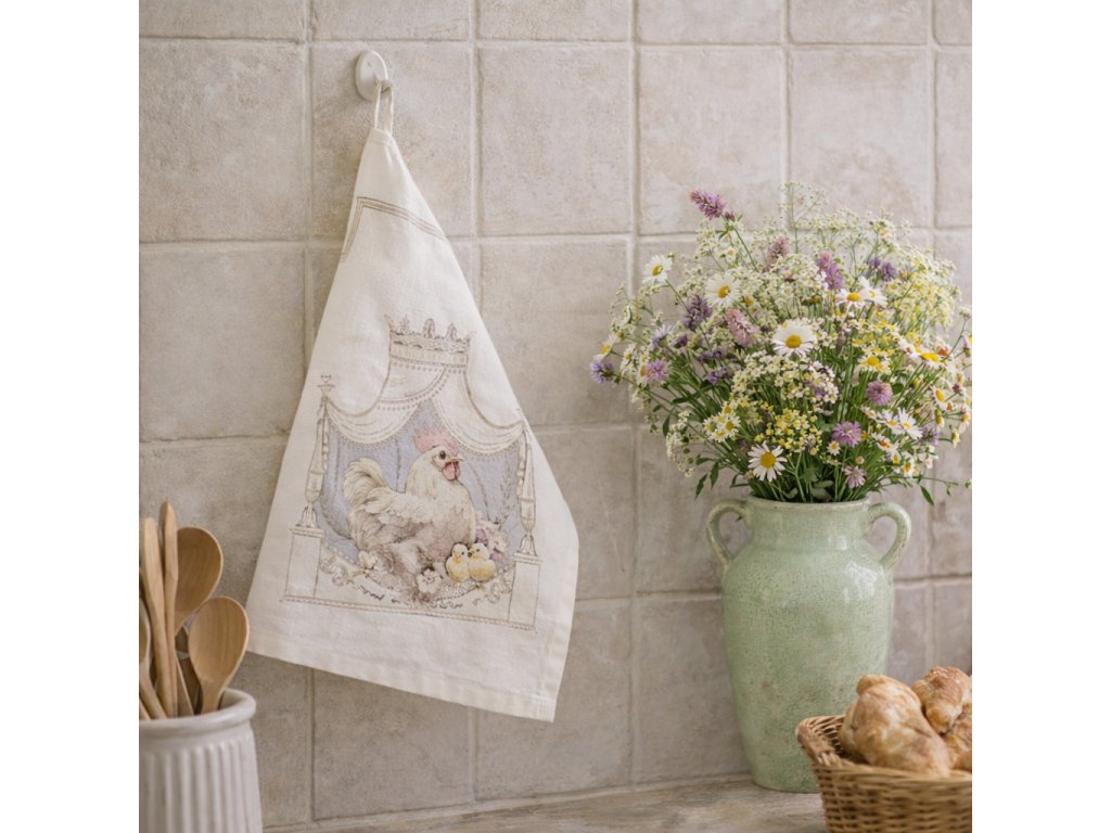 Bavlnená kuchynská utierka z kolekcie Coco je praktickým aj dekoratívnym doplnkom do kuchyne vo vidieckom štýle. Jemný motív sliepky, kohútikov a sliepočiek na bielom podklade v tlmených hnedých, modrých a červených odtieňoch vytvára príjemnú, autentickú atmosféru vidieckeho domova.