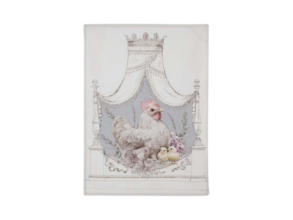 rozmery: 50 × 70 cm • materiál: 100 % bavlna • kolekcia: Coco • motív: sliepka, kohútiky a sliepočky • farba: biely podklad, hnedé / modré / červené odtiene • štýl: vidiecky / vintage • použitie: kuchynská utierka
