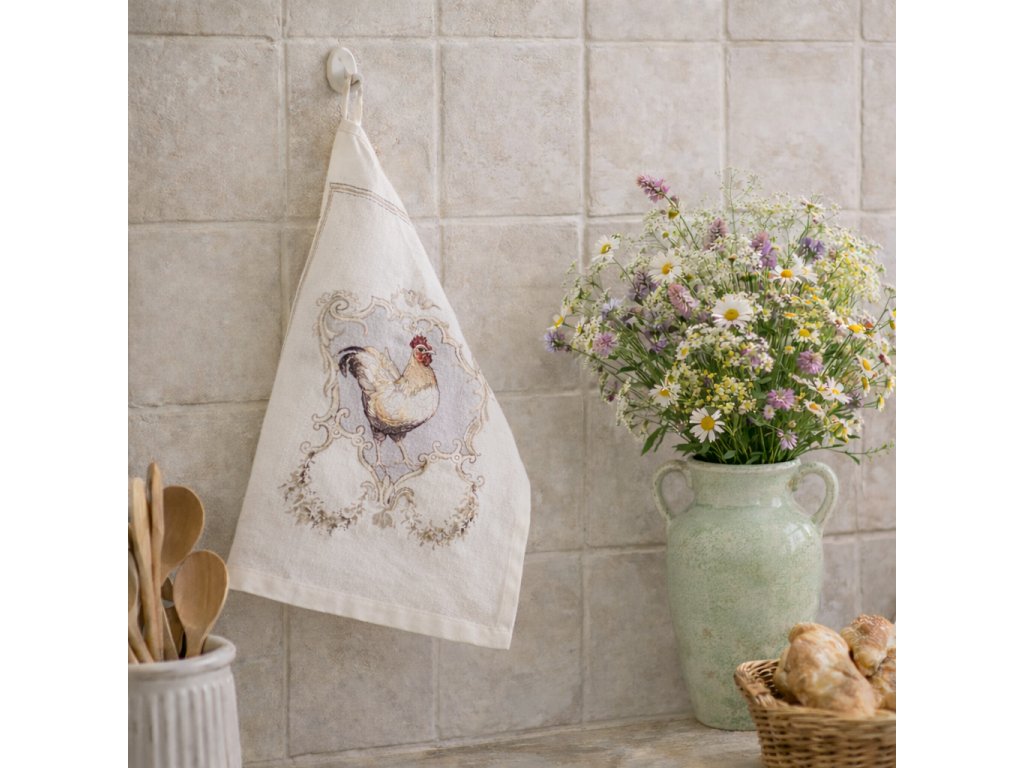 rozmery: 50 × 70 cm • materiál: 100 % bavlna • kolekcia: Coco • motív: kohútik • farba: biely podklad, hnedé / modré / červené odtiene • štýl: vidiecky / vintage • použitie: kuchynská utierka