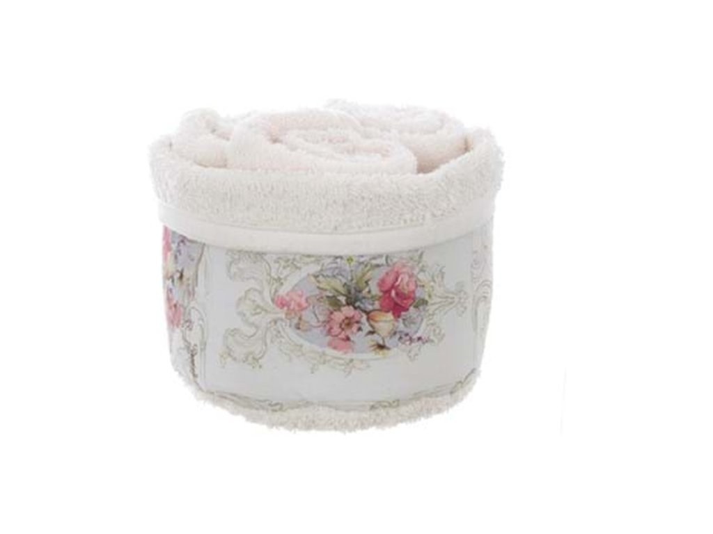 Dekoratívny látkový košík s tromi malými uterákmi je romantickým a praktickým doplnkom do kúpeľne alebo kuchyne v vintage a shabby chic štýle. Jemný kvetinový motív ružičiek pôsobí nežne a nadčasovo a dodáva priestoru útulnú atmosféru.