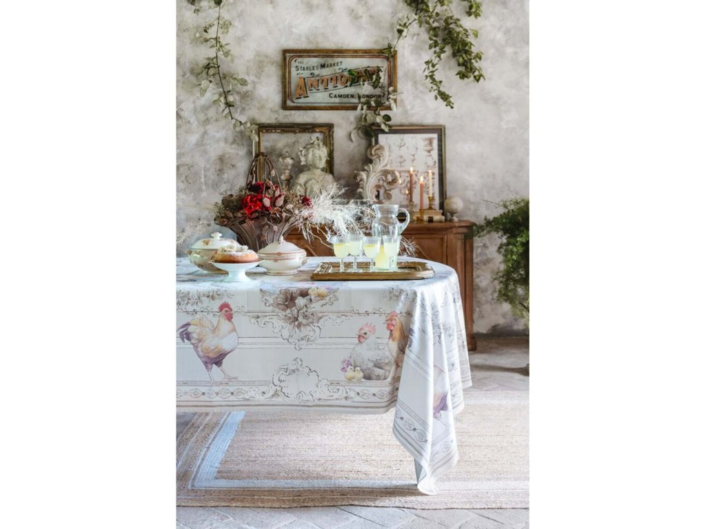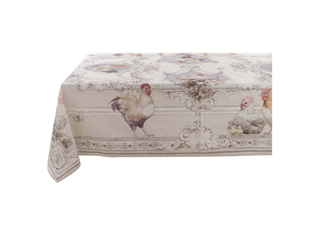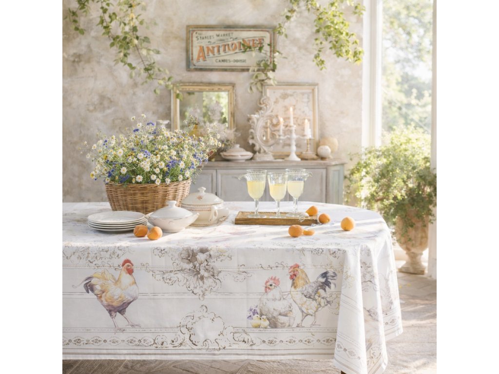 Elegantný bavlnený obrus z kolekcie Coco je krásnym doplnkom stolovania vo vidieckom a rustikálnom štýle. Jemný motív kohútikov a sliepočiek na bielom podklade v tlmených hnedých, modrých a červených odtieňoch vytvára príjemnú, autentickú atmosféru vidieckeho bývania.