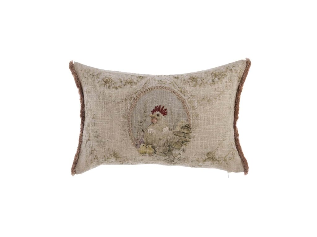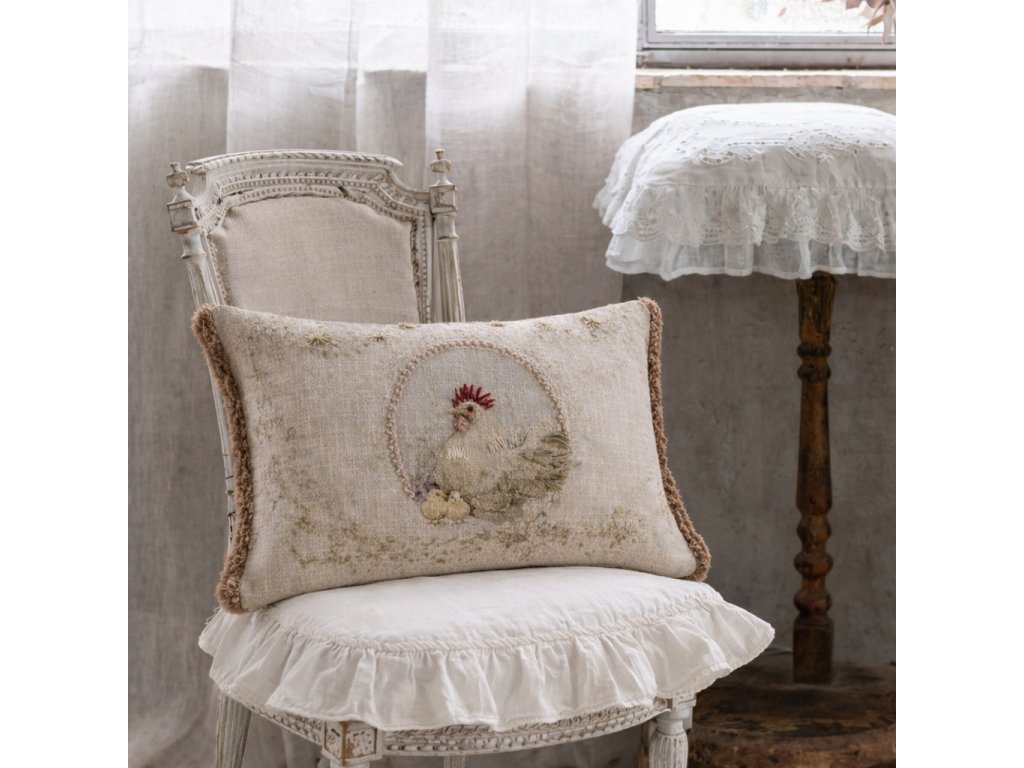 Bavlnený vankúš s potlačou a výšivkou je krásnym dekoratívnym doplnkom do interiéru vo vidieckom a vintage štýle. Jemný vidiecky motív kohútikov a sliepočiek na bielom podklade v tlmených hnedých, modrých a červených odtieňoch vytvára príjemnú, autentickú atmosféru domova.
