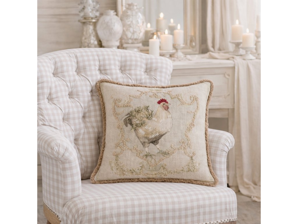Bavlnený vankúš s potlačou a výšivkou je krásnym dekoratívnym doplnkom do interiéru vo vidieckom a vintage štýle. Jemný vidiecky motív kohútikov a sliepočiek na bielom podklade v tlmených hnedých, modrých a červených odtieňoch vytvára príjemnú, autentickú atmosféru domova.