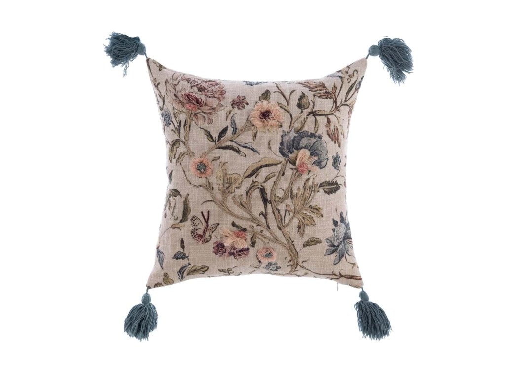 rozmery: 40 × 40 cm • materiál: 100 % bavlna • kolekcia: Mocha Mousse • úprava: potlačený, vyšívaný • dekor: 4 strapce • štýl: vintage / shabby chic • použitie: dekoračný vankúš • súčasťou balenia: výplň