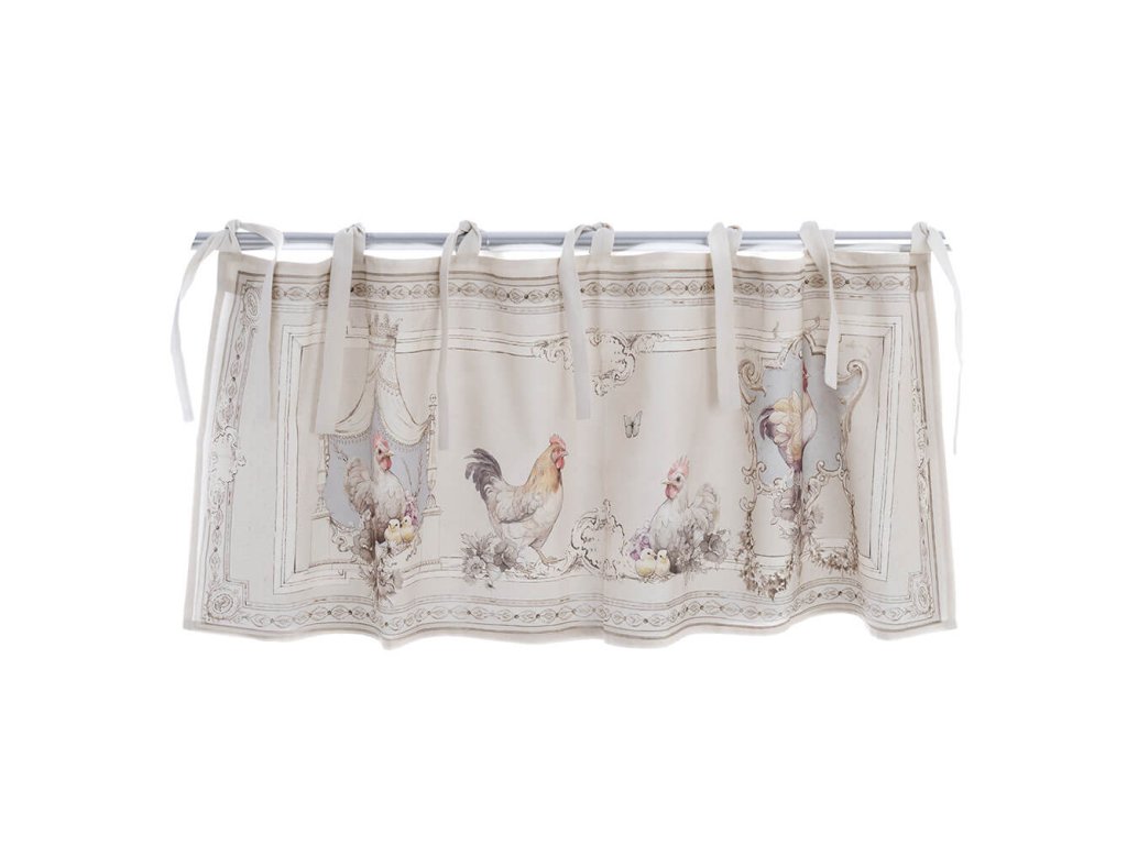 Bavlnený záves z kolekcie Coco je krásnym textilným doplnkom do kuchyne či vidieckeho interiéru. Jemný vidiecky motív kohútikov a sliepočiek na bielom podklade v tlmených hnedých, modrých a červených odtieňoch vytvára príjemnú, útulnú atmosféru.