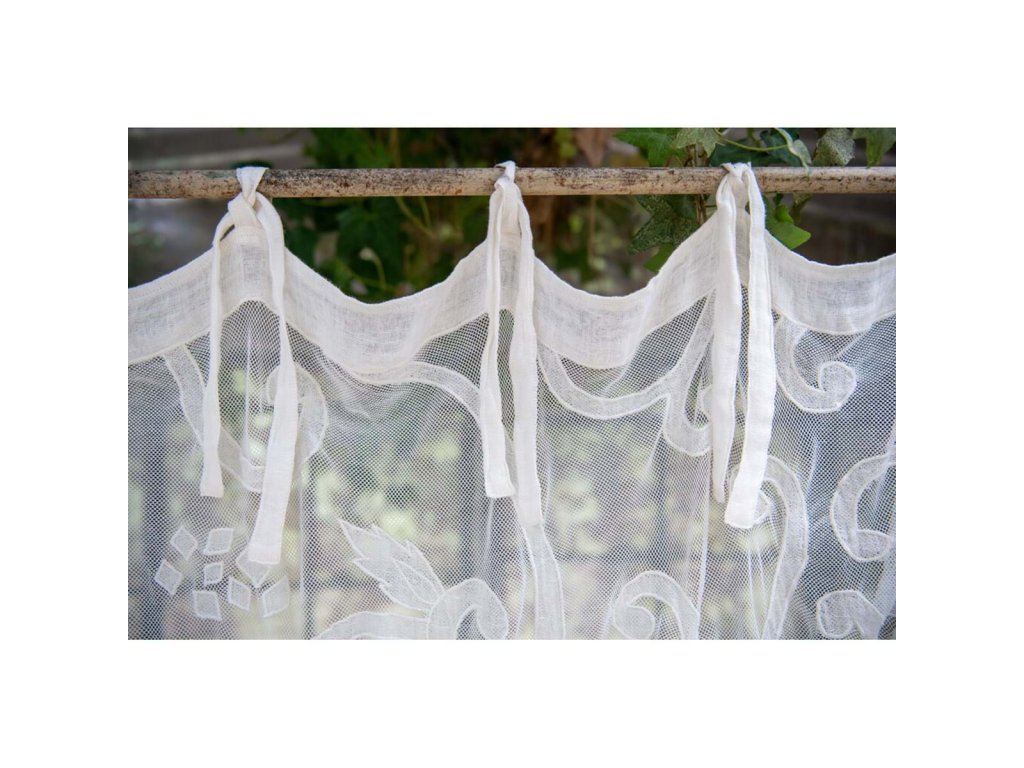 Elegantný krátky záves z kolekcie Soffio v bielej farbe v sebe spája jemnosť prírodných materiálov a romantický taliansky dizajn. Horná časť je bohato zdobená vyšívanými ornamentmi, zatiaľ čo spodná časť je jednoduchá a polopriesvitná, vďaka čomu záves krásne prepúšťa svetlo a vytvára vzdušnú, svetlú atmosféru.