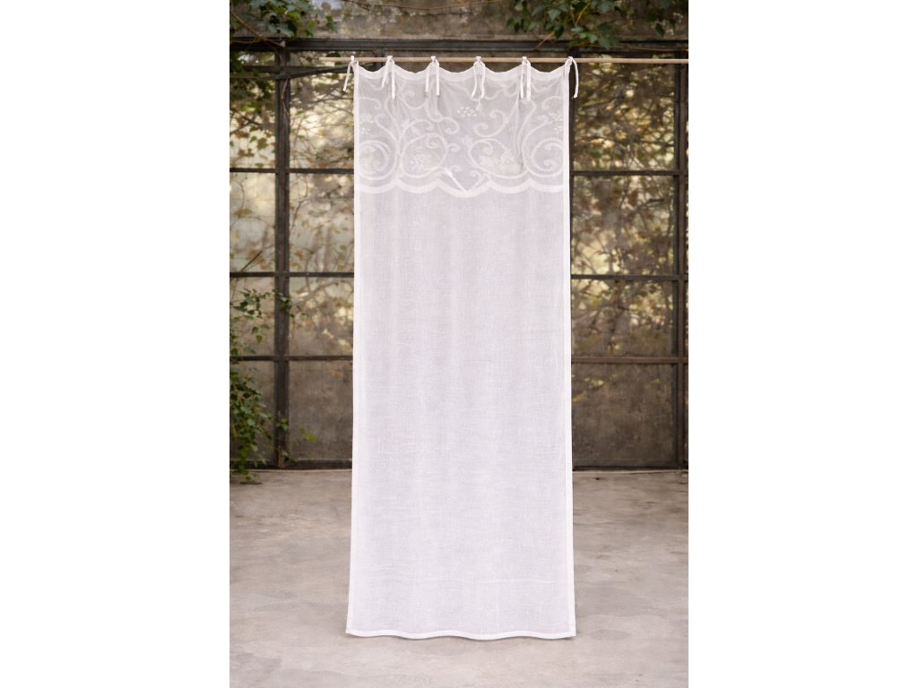 Elegantný krátky záves z kolekcie Soffio v bielej farbe v sebe spája jemnosť prírodných materiálov a romantický taliansky dizajn. Horná časť je bohato zdobená vyšívanými ornamentmi, zatiaľ čo spodná časť je jednoduchá a polopriesvitná, vďaka čomu záves krásne prepúšťa svetlo a vytvára vzdušnú, svetlú atmosféru.