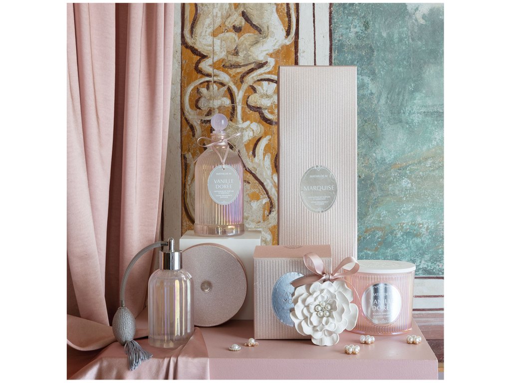 Zdôrazňuje tri symbolické vône Mathilde M: orientálnu Marquise, kvetinovú Rose Élixir a sladkú Vanille Dorée.