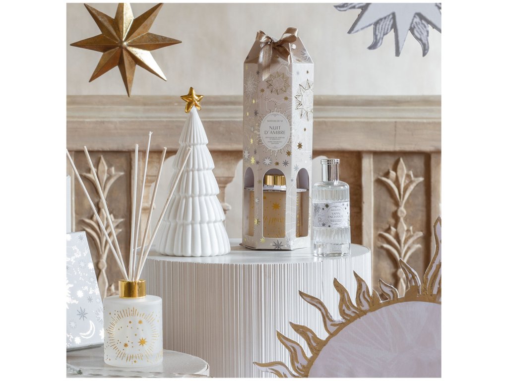 Objavte všetku eleganciu a jemnosť izbového difuzéra vôní Fête Céleste. Vďaka sieťotlačovým trblietavým zlatým vzorom tento skutočný dekoratívny predmet inšpirovaný krásou hviezd prevonia stredne veľkú miestnosť na niekoľko týždňov. Vybielené stonky ratanu, jemne naaranžované vo fľaštičke, sú kapilárne impregnované parfumom, ktorý ho postupne rozptýli do okolitého vzduchu.