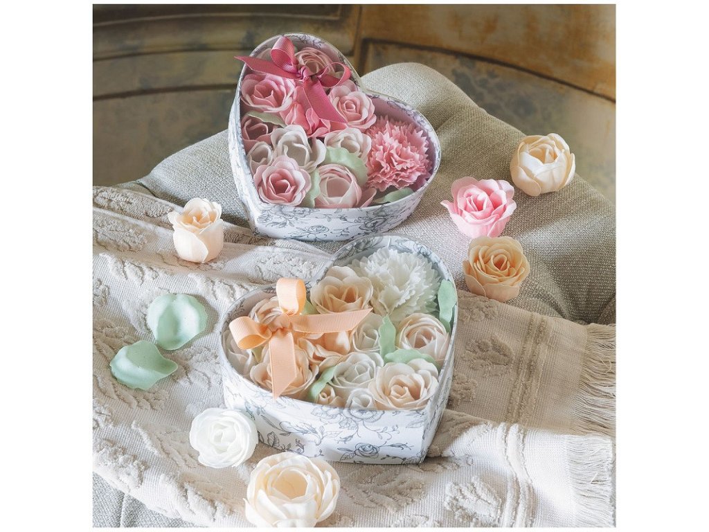 Nechajte sa uchvátiť touto elegantnou krabičkou v tvare srdca, ktorá obsahuje jemné lupienky mydla s vôňou ruže v telových a bielych tónoch.