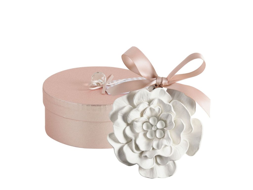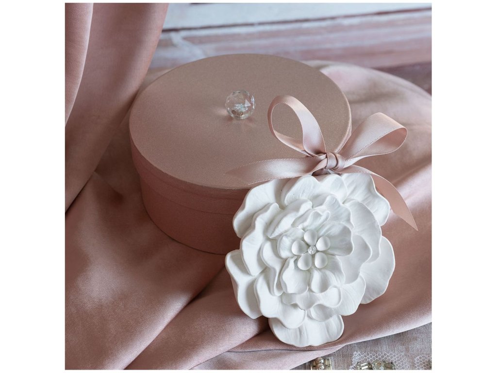 Táto pôvabná darčeková sada obsahuje veľkorysý, starostlivo ručne vyrezávaný, voňavý sadrový kvet, ozdobený perlovým drahokamom v strede. Jemne a dlhotrvajúco prevonia všetky malé priestory vo vašej domácnosti, ako sú skrine, zásuvky alebo batožina. Nechajte sa zviesť jemným perleťovo ružovým odtieňom, ktorý zdobí túto krabičku.