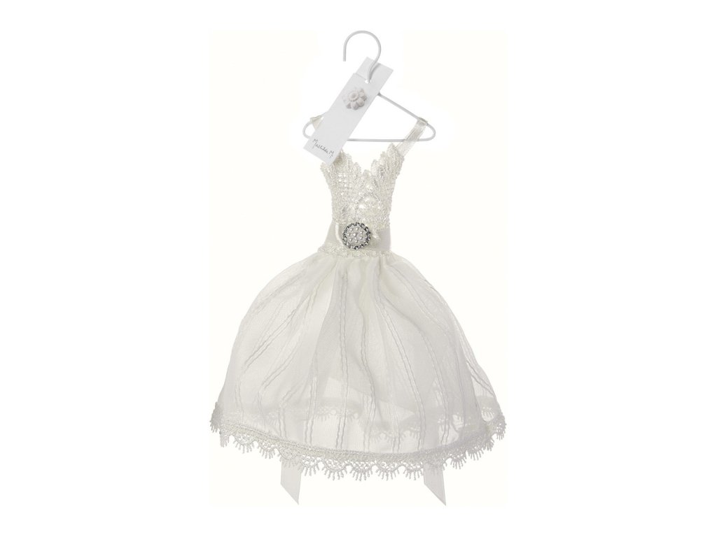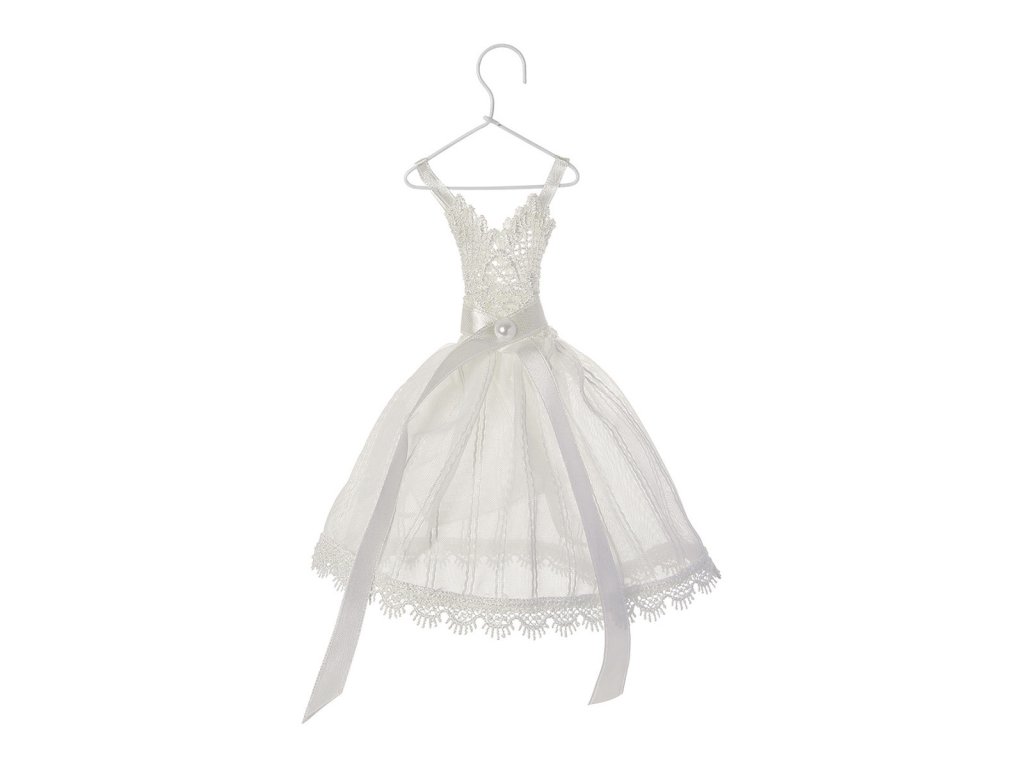 Tieto elegantné svadobné šaty z čipky a organzy sú ideálne na uloženie malých vonných difuzérov (malé vrecko pod sukňou). Vďaka vešiaku ich môžete zavesiť do šatníka.