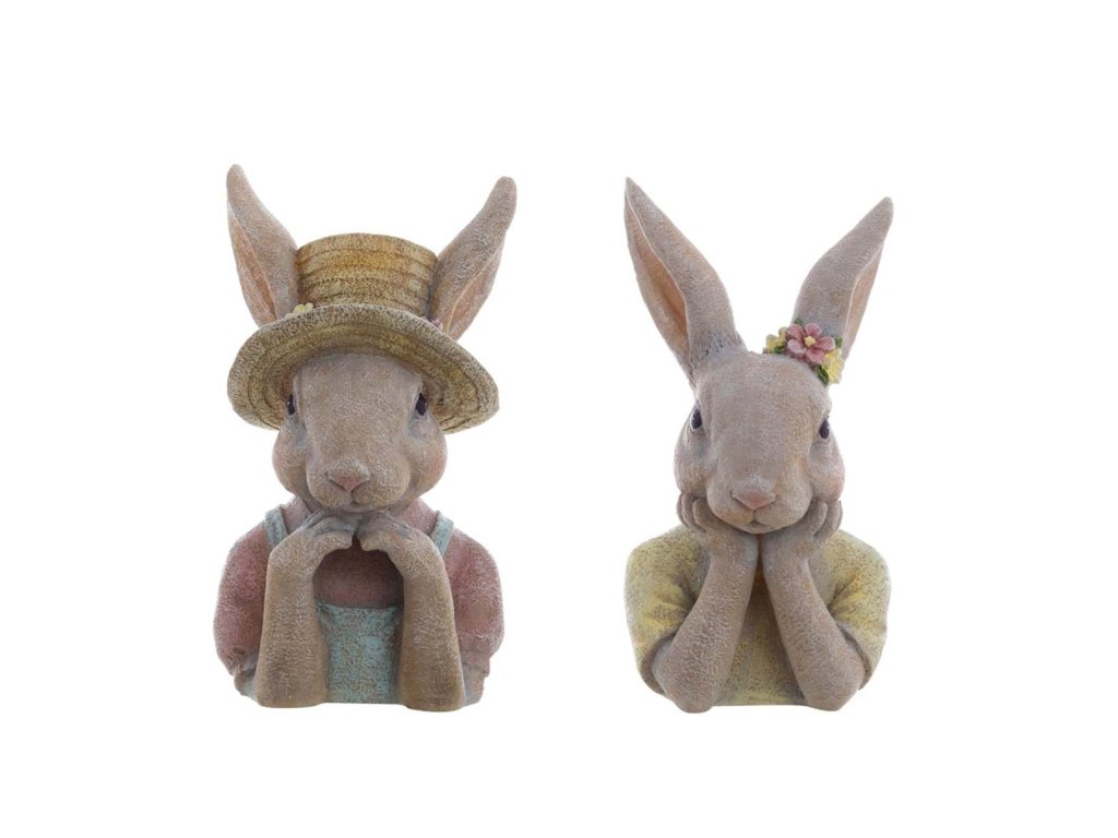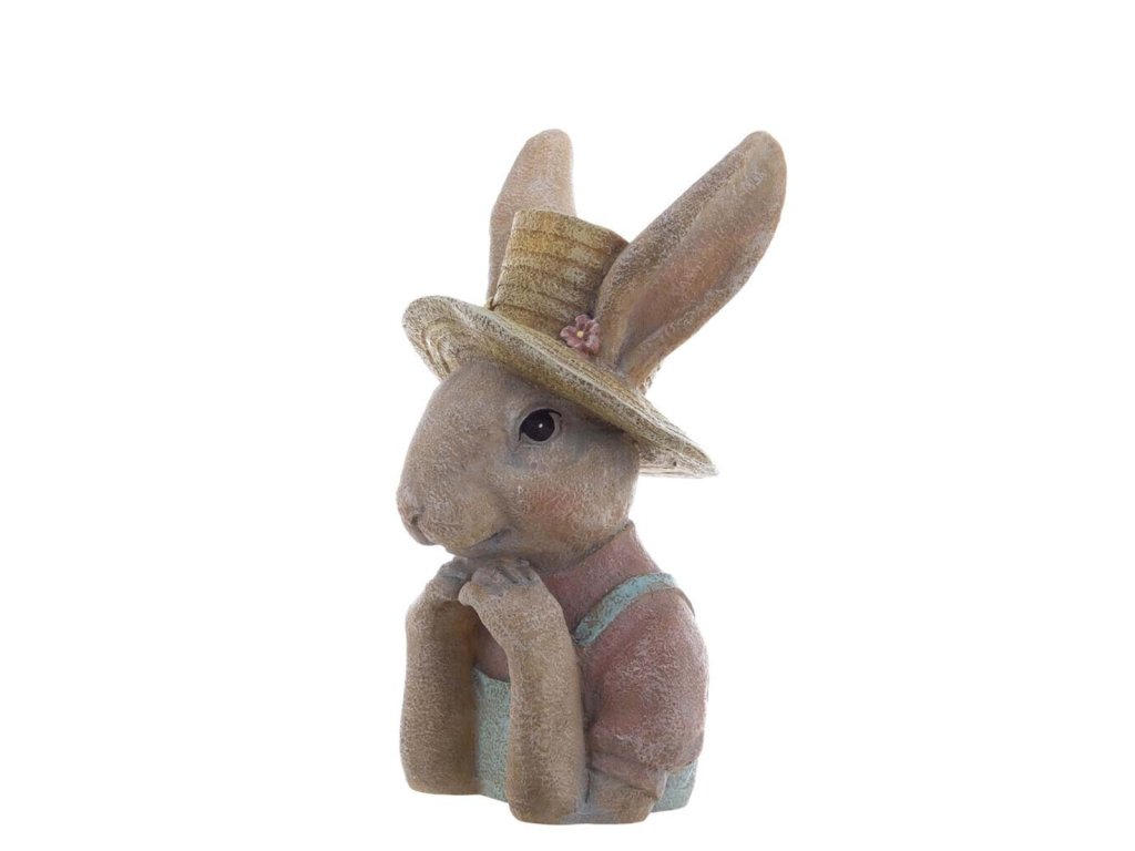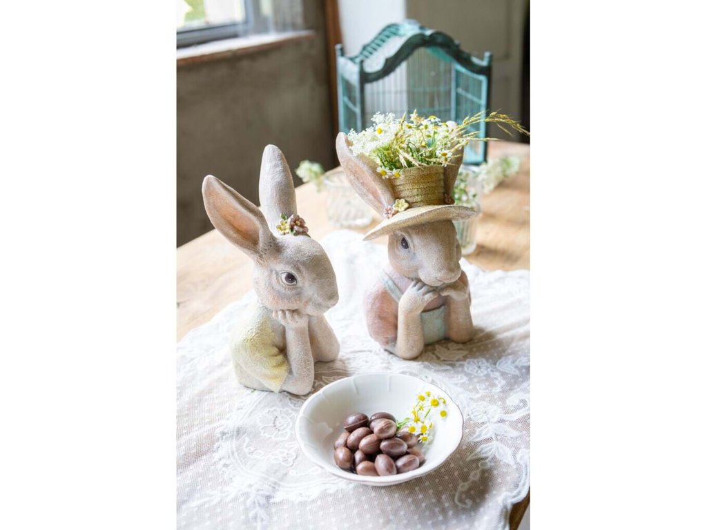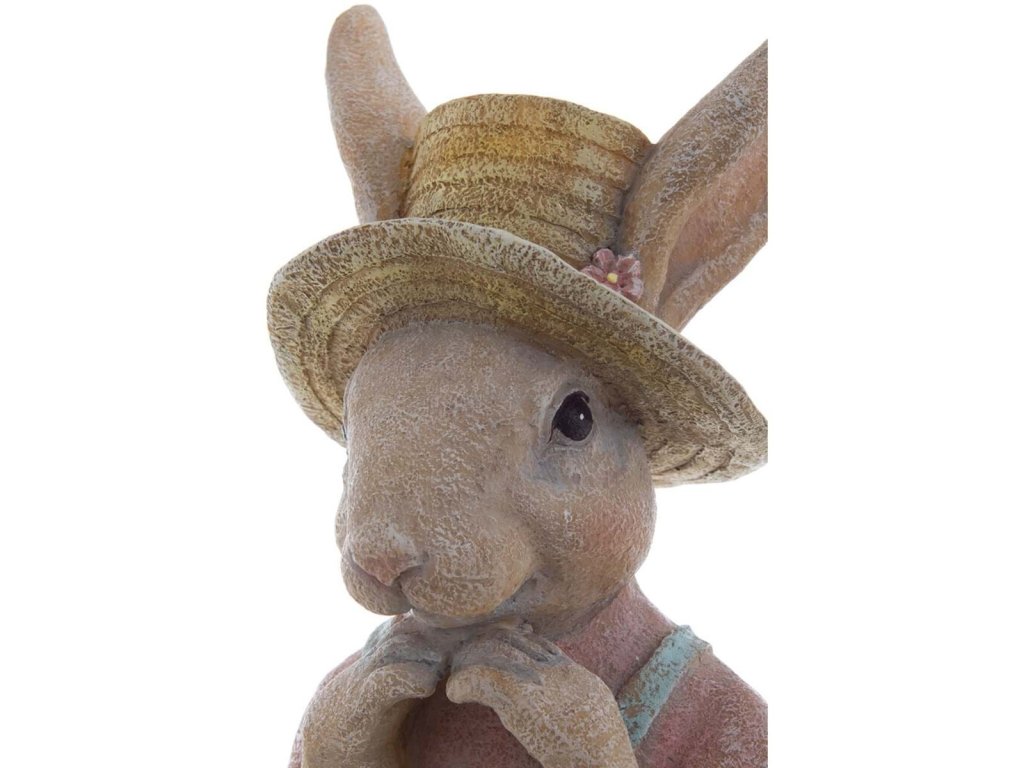 Veľkonočná dekorácia zajačika v klobúku z polyrezinu. Originál z dielne Blanc Maricló. Novinka Jar/Leto 2024. Cena za 1 kus A.
