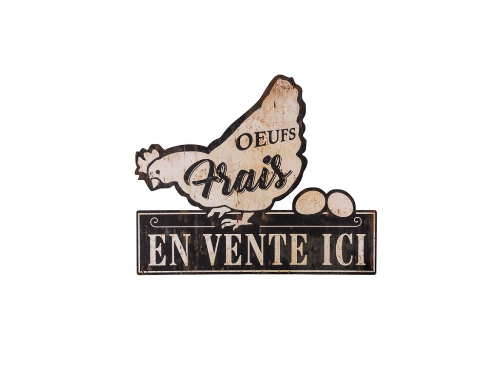 Dekoratívna tabuľa Oeouf frais – Čerstvé vajíčka od značky Antic Line prináša do interiéru autentickú atmosféru francúzskeho vidieka. Vintage reklamný panel je ideálny ako štýlová nástenná dekorácia do kuchyne, jedálne, farmárskeho obchodu alebo kaviarne. Kombinácia kovu a papierového motívu dodáva tabuli originálny retro vzhľad, ktorý krásne zapadne do Provence, rustikálneho či shabby chic štýlu.