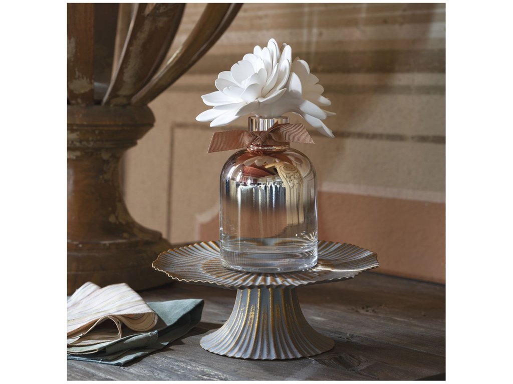 Objavte elegantný izbový difuzér vôní Valse Florale, ktorý prevonia váš interiér na dlhú dobu. Ručne vyrobené dva prepletené porcelánové kvety sušienky spočívajú vo fľaši z medeného skla s efektom kravaty a farbiva.