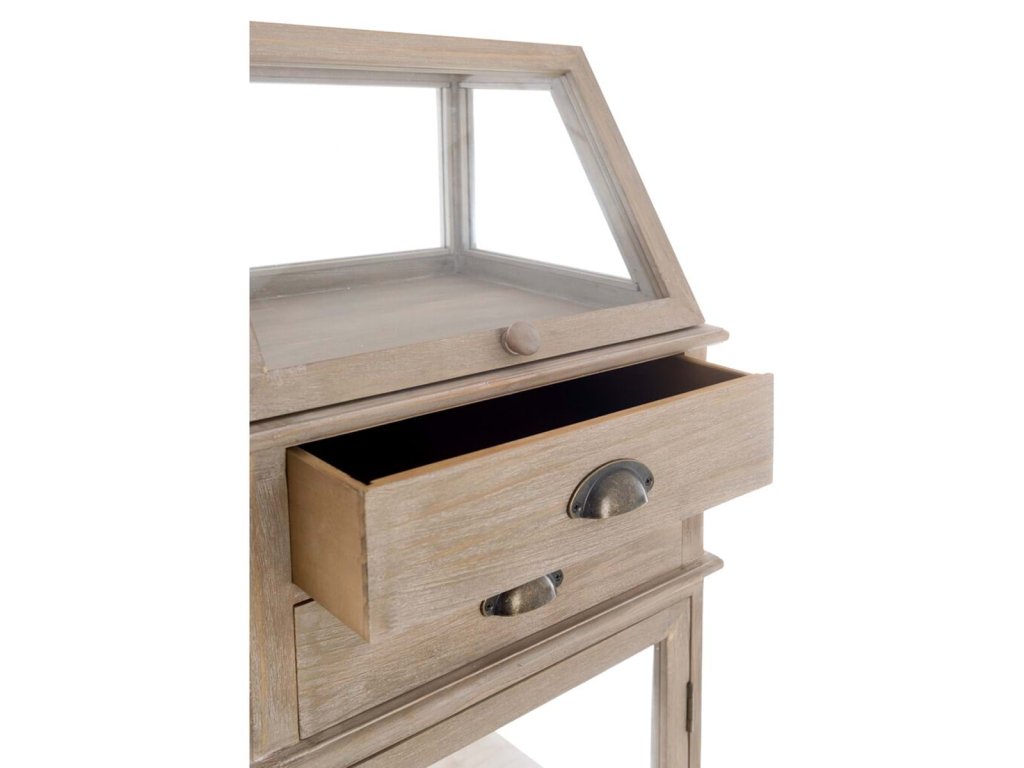 Vitrínka z kolekcie Natural Nuances je elegantným a praktickým kúskom určeným na vystavenie cenností, šperkov, porcelánu alebo drobných dekorácií. Vďaka presklenej časti a odklopiteľnému vrchu poskytuje nielen prehľadné usporiadanie, ale aj jednoduchý prístup k uloženým predmetom. Spodná časť je doplnená o dve zásuvky, ktoré ponúkajú ďalší úložný priestor na menšie doplnky. Kombinácia borovicového dreva a preglejky zvýrazňuje prirodzený charakter nábytku a zapadne do interiéru v prírodnom, vidieckom alebo rustikálnom štýle.