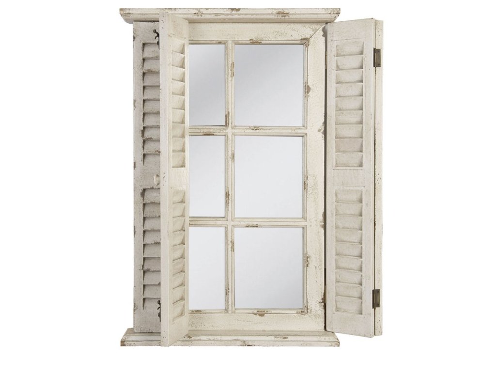 Výrazné nástenné zrkadlo s dekoratívnymi okenicami je štýlovým doplnkom do interiéru v country / vidieckom štýle. Biele drevené prevedenie pôsobí svetlo, čisto a romanticky a zrkadlo sa tak stáva skutočným dominantným prvkom priestoru.
