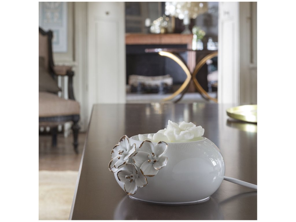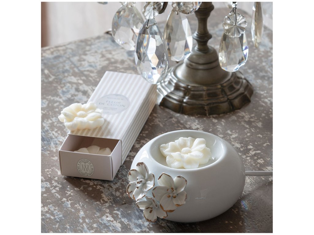 Nechajte sa zviesť týmto keramickým elektrickým napaľovačom parfémov Amour de Fleurs, zdobeným rafinovanými ručne pozlátenými kvetmi. Jednoduché použitie a bezpečnosť, rýchlo a intenzívne prevoňajú stredne veľkú miestnosť. Umiestnite naň jednu alebo viac vonných voskových dekorácií Mathilde M a nechajte jemne roztopiť. Voskové ozdoby počas procesu zahrievania postupne uvoľňujú svoju jemnú vôňu. Keď už ozdoby nevydávajú vôňu, jednoducho ich vymeňte.