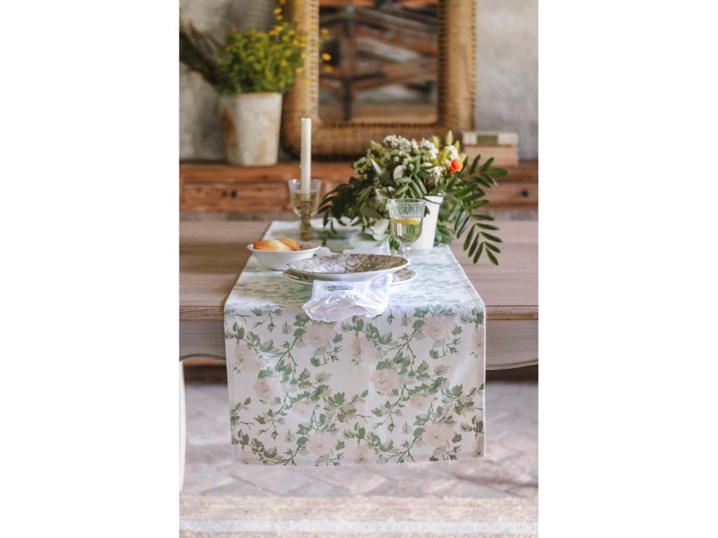 rozmery: 140 × 180 cm • materiál: 70 % bavlna, 30 % syntetické vlákno • farba: jemná zelená, biela, ružová • štýl: romantický / vidiecky • použitie: obrus