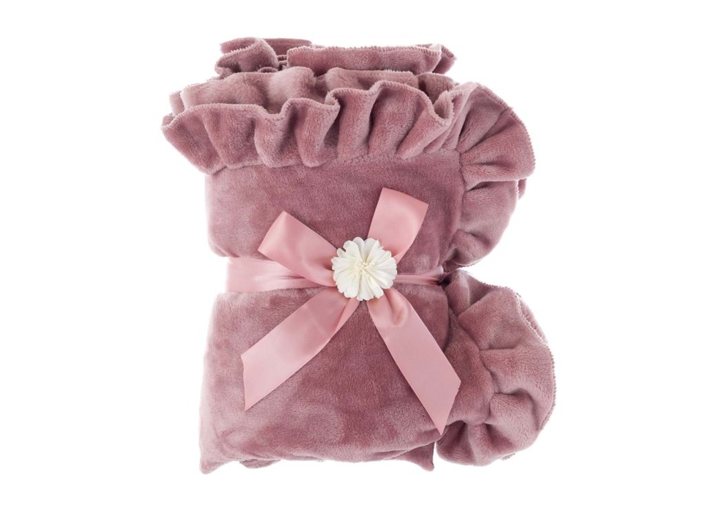 Jemnučká deka s volánikom hrúbky 260GSM, v ružovom prevedení. Previazaná mašľou. Vhodná aj ako prikrývka na posteľ. Pranie v práčke. Originál z dielne Blanc Mariclo.