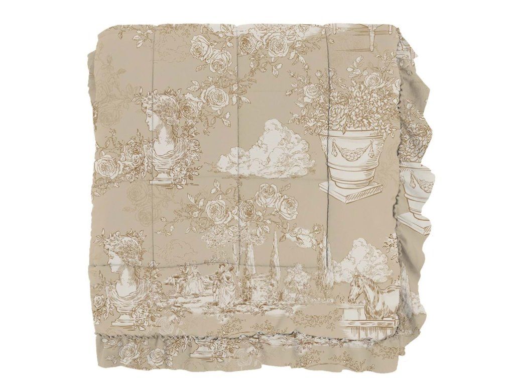 rozmer: 260 × 260 cm • materiál: 100 % mikrovlákno • farba: béžová • gramáž: 300 GSM • vlastnosti: volán, polyesterová výplň, pranie v práčke • štýl: romantický / vintage / elegantný • použitie: interiér – prehoz na posteľ • výrobca: Blanc Mariclò