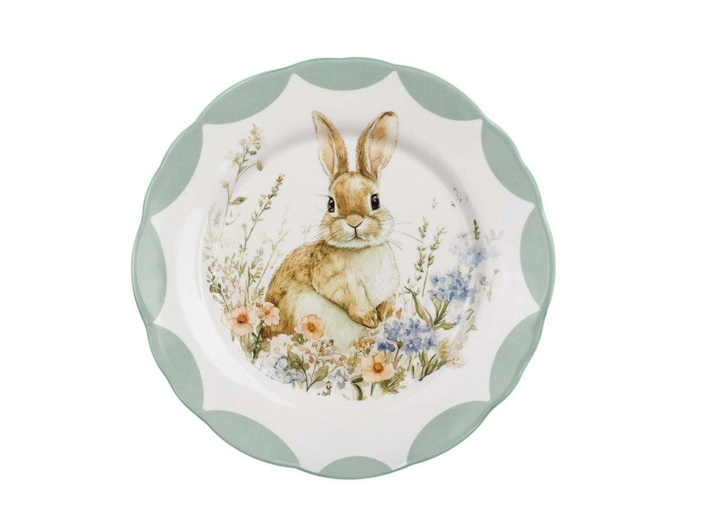 priemer: Ø 21,8 cm • výška: 2,5 cm • materiál: keramika • motív: maľovaný zajac • štýl: veľkonočný / vintage • použitie: dezertný tanier • údržba: vhodný do umývačky riadu a mikrovlnnej rúry