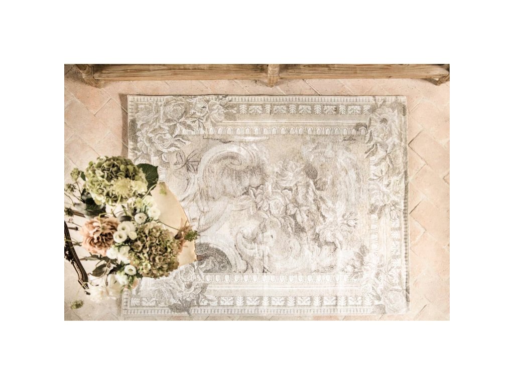 Jemný koberec s ornamentálnou potlačou v béžovom prevedení s protišmykovou úpravou. Originál z dielne Blanc Mariclo.