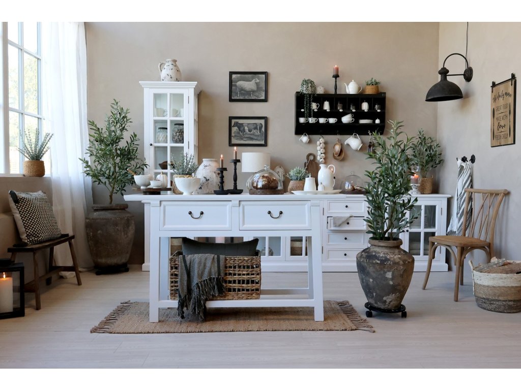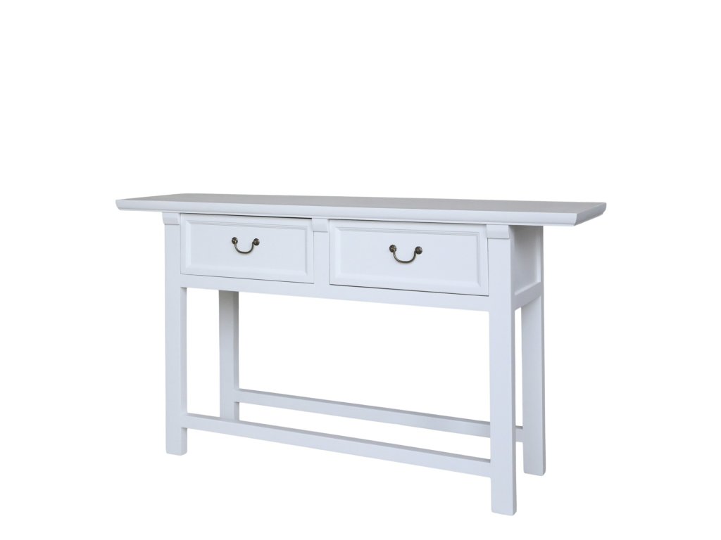 Tento praktický servírovací konzolový stôl je ručne vyrobený z recyklovaného dreva.ktoré je opatrené bielym náterom. Má praktické dve zásuvky.