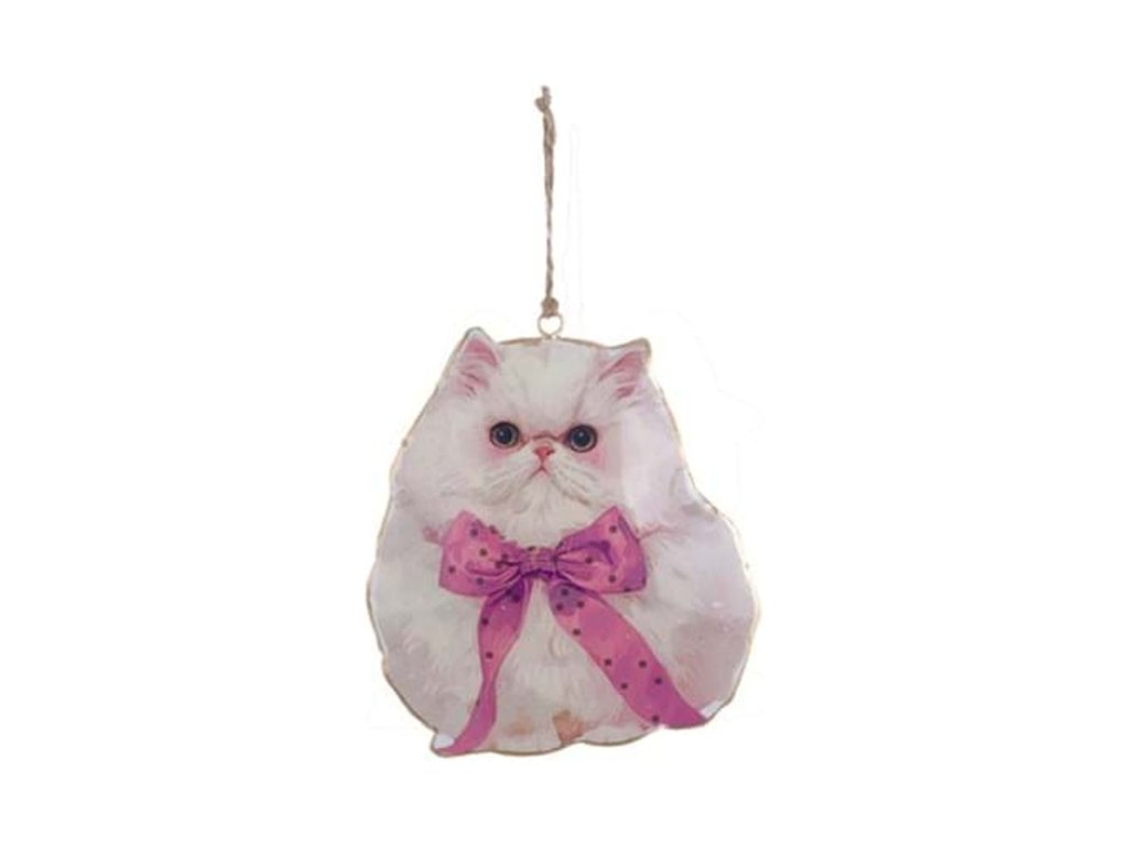 Milá závesná dekorácia s motívom mačky s mašličkou z kolekcie Coco je jemným doplnkom do jarnej alebo veľkonočnej výzdoby. Kovové prevedenie a špagátik na zavesenie umožňujú dekoráciu jednoducho umiestniť na vetvičky, veniec, okno alebo na stenu.