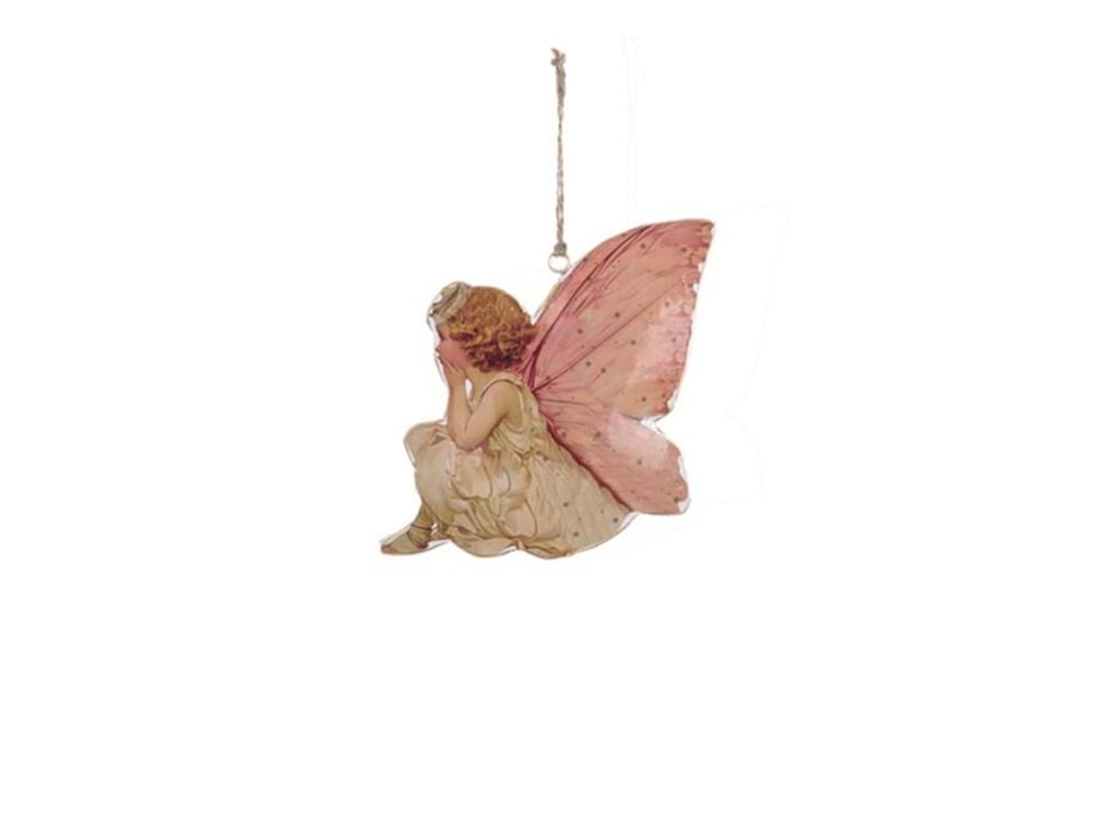 Romantická závesná dekorácia s motívom motýlej víly je jemným doplnkom do jarnej alebo rozprávkovej výzdoby interiéru. Kovové prevedenie a špagátik na zavesenie umožňujú dekoráciu jednoducho umiestniť na okno, vetvičky, veniec alebo na stenu.