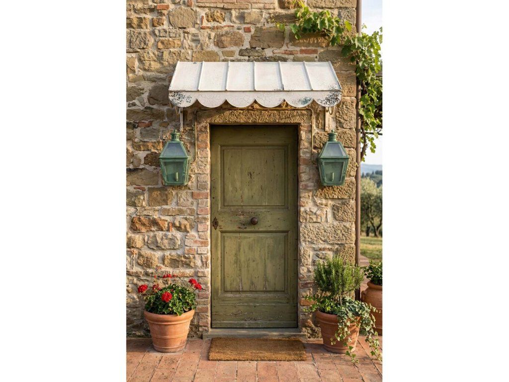 Elegantná kovová strieška na konzolách od značky Blanc Mariclò z kolekcie Antica Officina je praktickým a zároveň dekoratívnym riešením pre vstupné dvere. Vďaka krémovej patine pôsobí jemne vintage a dodáva exteriéru romantický charakter.