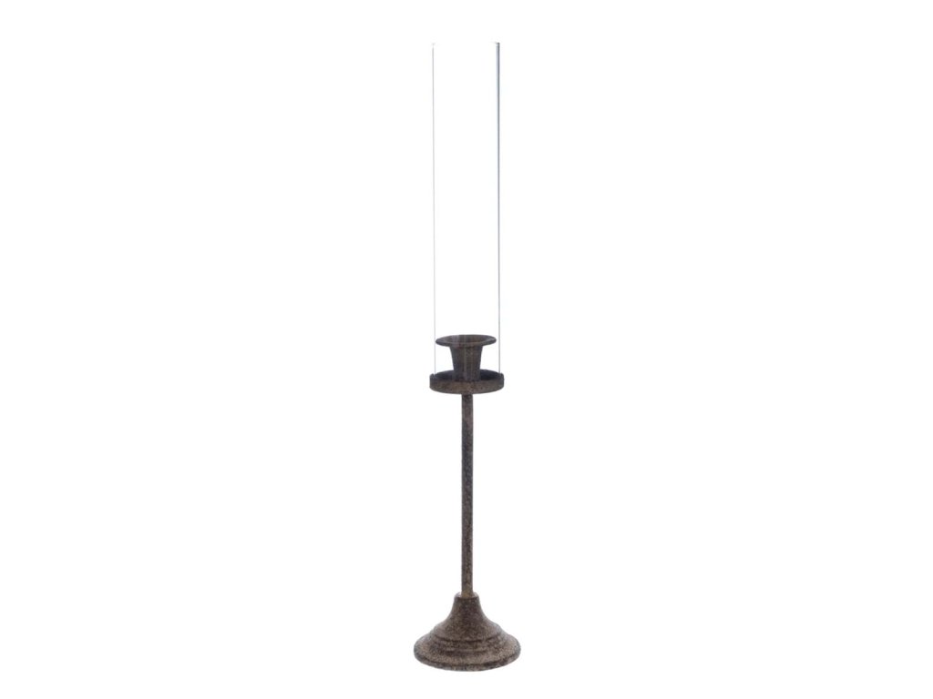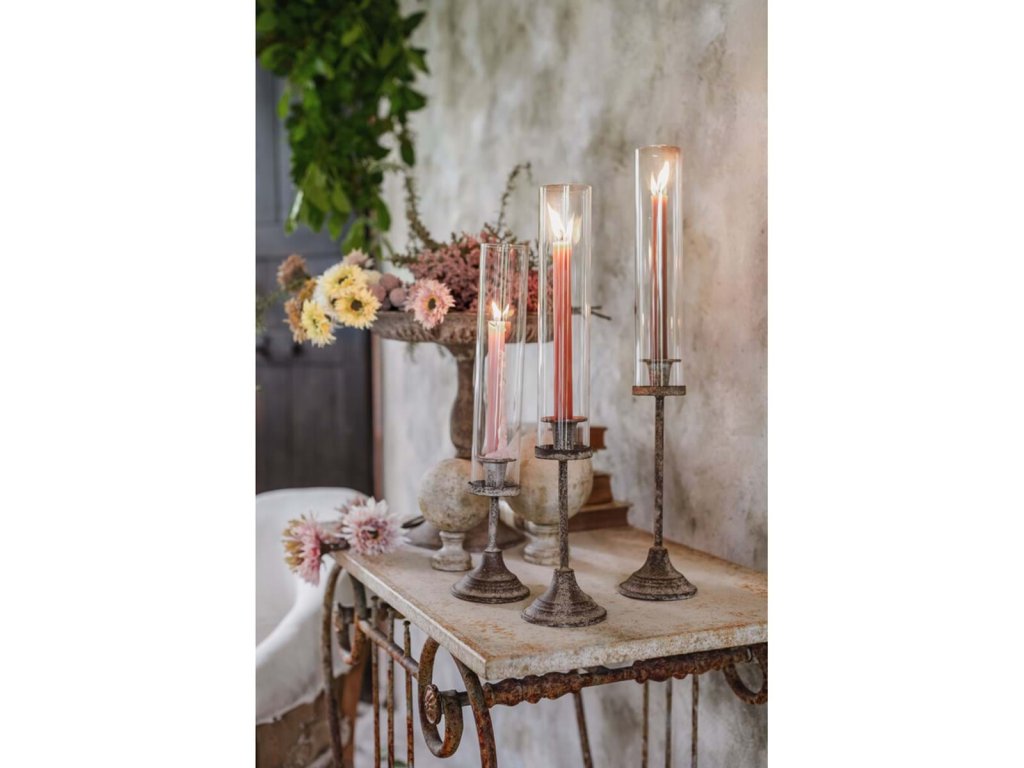 Kovový vysoký a úzky svietnik so sklom v starobylom vintage dizajne je elegantnou dekoráciou do interiéru aj chráneného exteriéru. Je určený na úzku sviečku a vďaka kombinácii kovu a skla pôsobí nadčasovo a jemne dekoratívne.