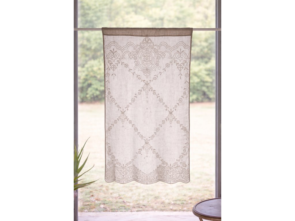 rozmery: 45 × 70 cm • farba: hnedá • materiál: 50 % ľan, 50 % bavlna • kolekcia: Luce • uchytenie: tunel na tyčku • dizajn: biela výšivka • štýl: vidiecky / vintage / prírodný • použitie: interiér