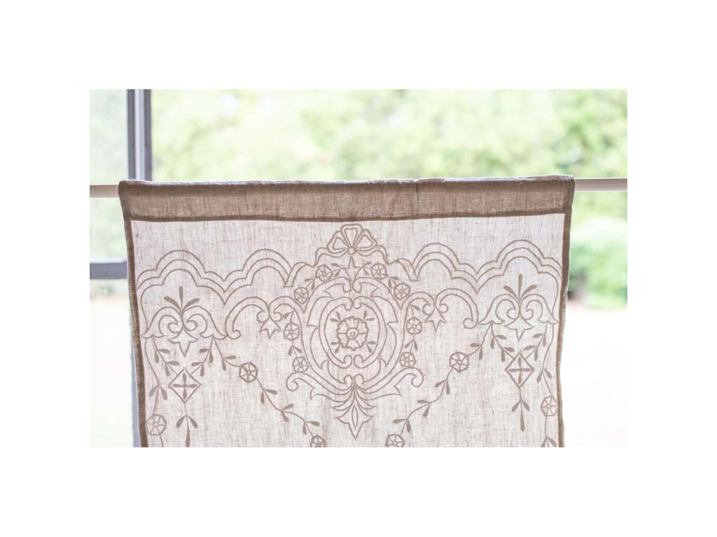 rozmery: 60 × 160 cm • farba: hnedá • materiál: 50 % ľan, 50 % bavlna • kolekcia: Luce • uchytenie: tunel na tyčku • dizajn: biela výšivka • štýl: vidiecky / vintage / prírodný • použitie: interiér