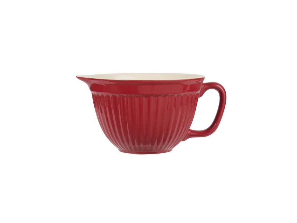 Kameninová glazovaná misa s uškom s dekoratívnym vrúbkovaním z kolekcie Mynte. Vnútro je krémové.