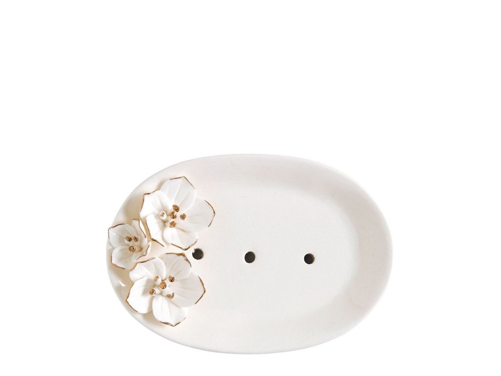 Keramická mydelnička s dierkami a pozlátenými kvietkami. Dizajn Amour de Fleurs.