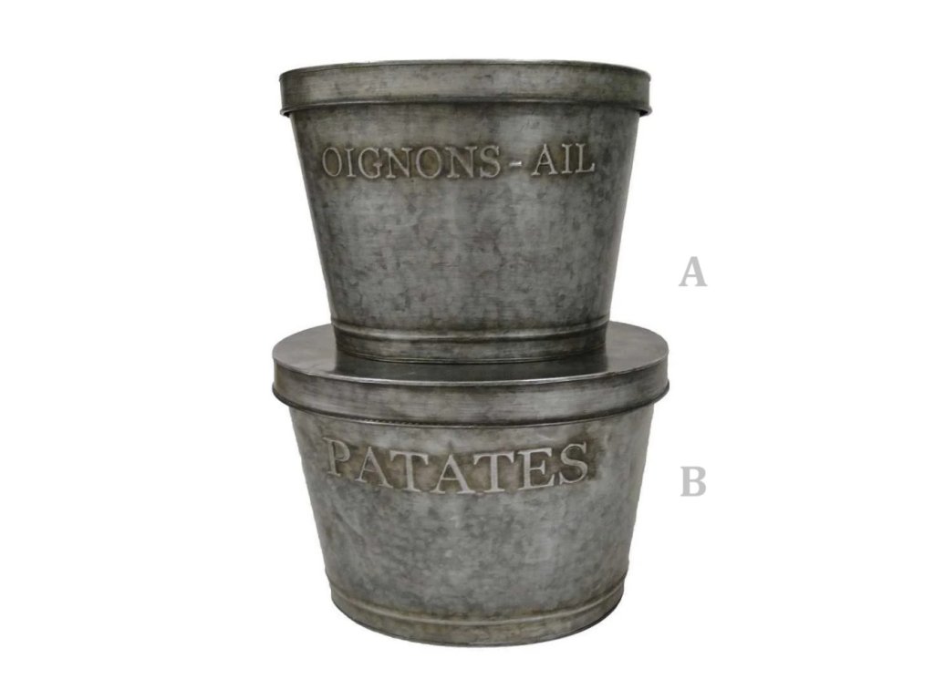 Nostalgické zinkové nádoby na uskladnenie zeleniny vás prenesú do čias tradičných francúzskych kuchýň. Nádoba s nápisom "PATATES" je určená pre zemiaky. Jedinečná patina dodáva týmto praktickým pomocníkom autentický vidiecky šarm a nádych starých čias.