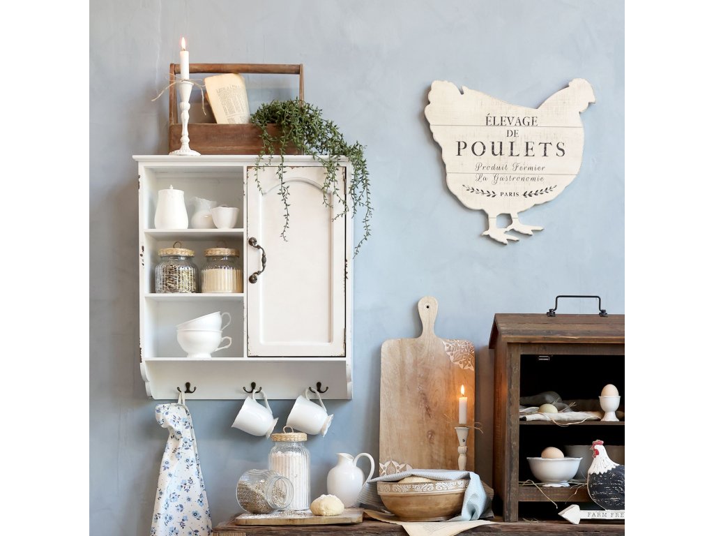 Praktická skrinka s policou a dvierkami na odkladanie kuchynských potrieb. Táto originálna nástenná skrinka je ručne vyrobený z borovicového dreva a patinovaná, takže malé individuálne rozdiely znamenajú, že každý kus má svoj vlastný jedinečný výraz. Kolekcia Marie Antoinette sa vyznačuje jemnou patinou a bielou maslovou farbou.