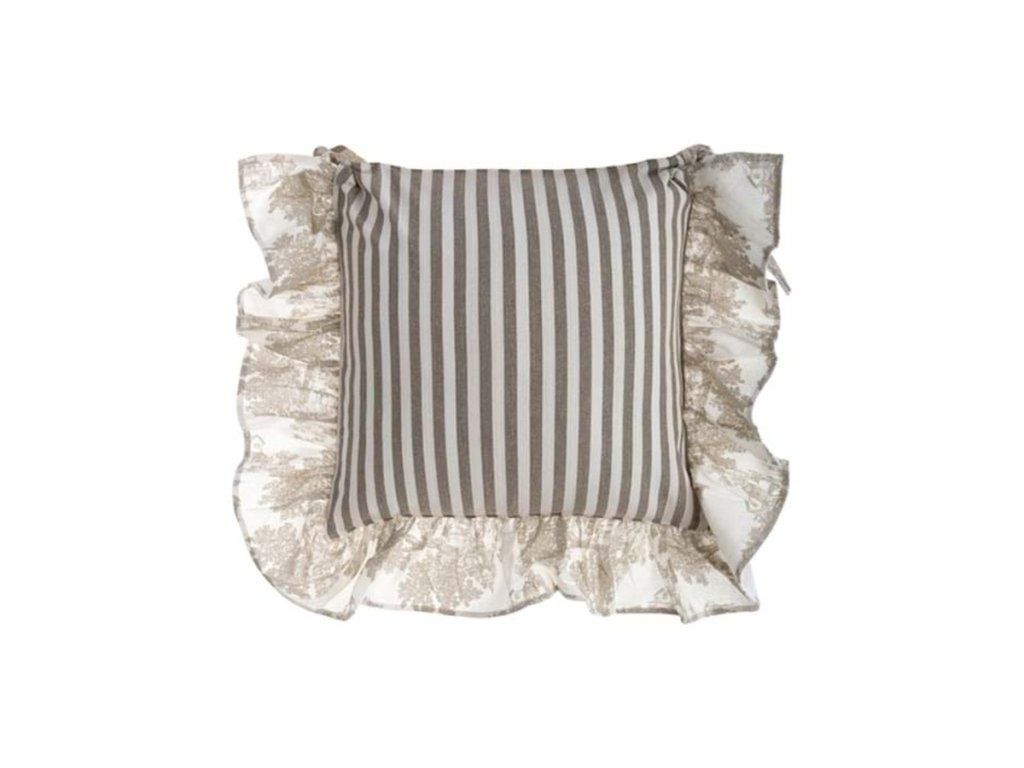 Dekoratívna návliečka na podsedák s volánom je štýlovým doplnkom, ktorý dodá sedeniu romantický a vidiecky charakter. Kombinácia vzoru Toile de Jouy a jemných pásikov vytvára nadčasový shabby chic vzhľad, ideálny do kuchyne, jedálne alebo vidieckeho interiéru.