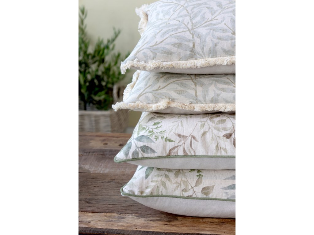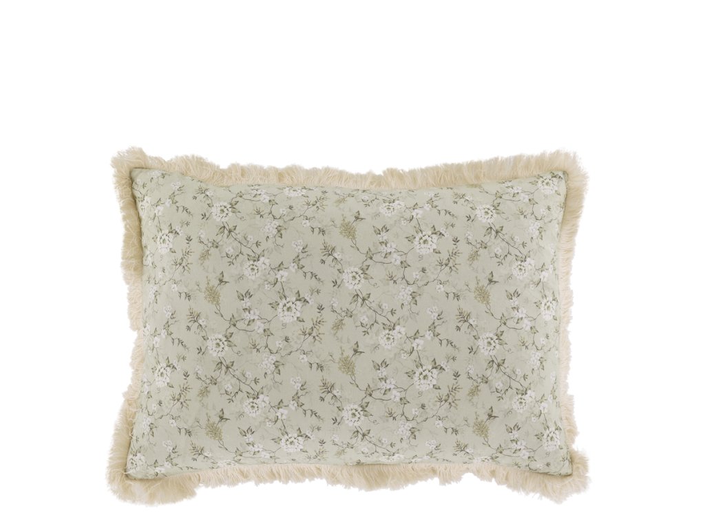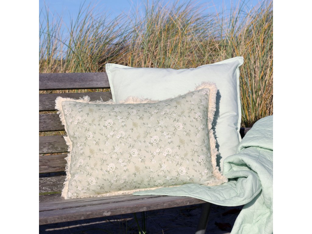 Dekoratívna obliečka Aix v odtieni verte (jemná zelená) s romantickým kvetinovým vzorom a ozdobnými strapcami je štýlovým doplnkom do vidieckeho aj elegantného interiéru. Jemný botanický motív pôsobí sviežo a harmonicky, zatiaľ čo strapce dodávajú textílii osobitý šarm.