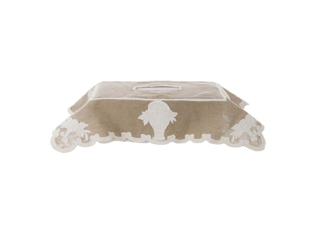 rozmer: 14 × 25 × 16 cm • materiál: 50 % ľan, 50 % bavlna • farba: béžová / biela výšivka • vlastnosti: bez náplne (bez vreckoviek) • štýl: vintage / romantický / vidiecky • použitie: interiér – obal na vreckovky • výrobca: Blanc Mariclò