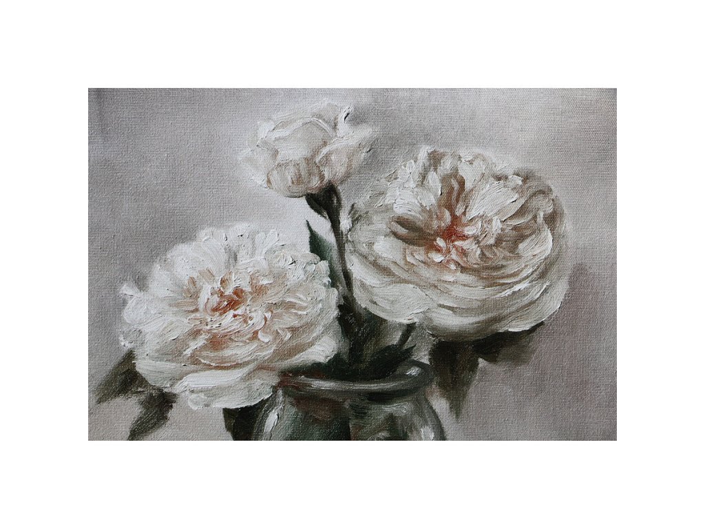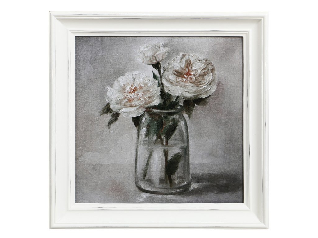 Obraz v bielom ráme s motívom kvetov pivónií. Reprodukcia, ktorá pôsobí ako olejomaľba. Bez zasklenia.