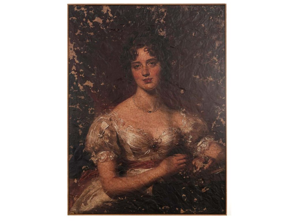 Nástenná dekorácia plátna v ráme s replikou starobylého obrazu dámy.