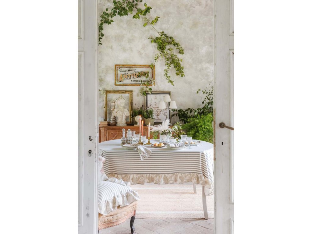 Elegantný obrus s dekoratívnym volánom je výrazným textilným doplnkom stolovania v romantickom a vidieckom štýle. Kombinácia motívu Toile de Jouy a jemných pásikov v béžovo-bielom prevedení pôsobí nadčasovo a dodáva stolu noblesnú, harmonickú atmosféru.