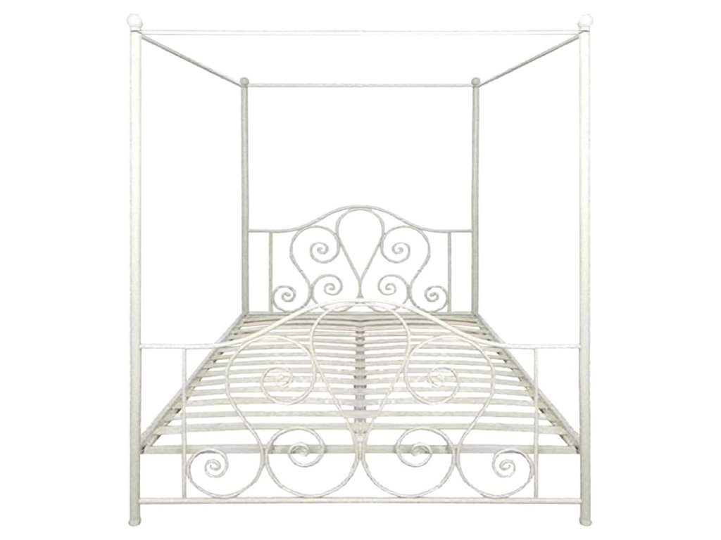 Kovová konštrukcia postele s roštom a nebesami.