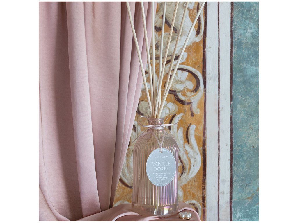 Tento difuzér do miestnosti, skutočný dekoratívny predmet, nepretržite prevonia váš domov. Jemne usporiadané v rebrovanom, dúhovom sklenenom puzdre, prírodné ratanové tyčinky absorbujú vôňu kapilárnym pôsobením. Tento difuzér prevonia stredne veľkú miestnosť niekoľko týždňov.