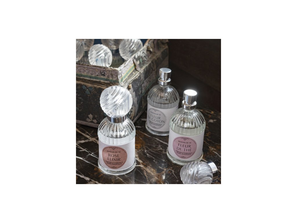 Priestorový izbový parfém vo forme spreju s rozprašovačom v sklenenej fľaštičke.