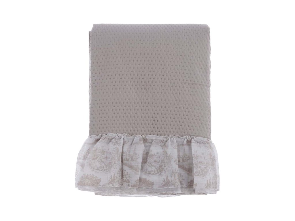 rozmery: 250 × 250 cm • gramáž: 180 GSM • materiál: 100 % mikrovlákno • kolekcia: Toile de Jouy • volán: 20 cm • štýl: vintage / shabby chic • použitie: prikrývka