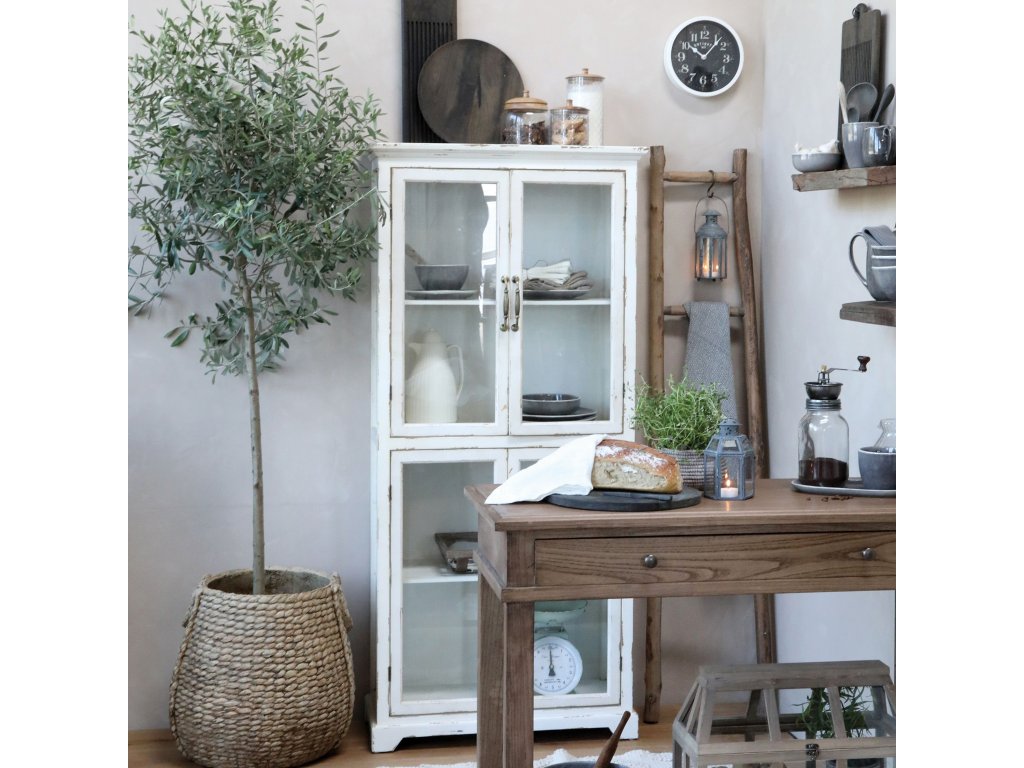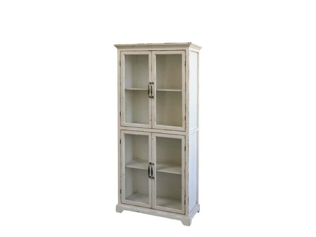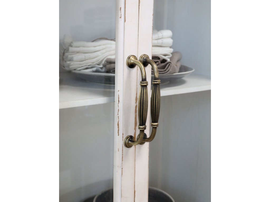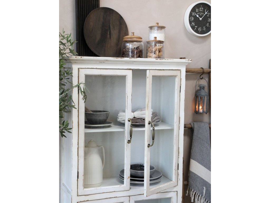 Praktická dvojdielna vitrína so sklenenými dvierkami z borovicového dreva a patinovaná, takže malé individuálne rozdiely znamenajú, že každý kúsok má svoj vlastný jedinečný výraz. Kolekcia Marie Antoinette sa vyznačuje jemnou patinou a krémovou farbou.